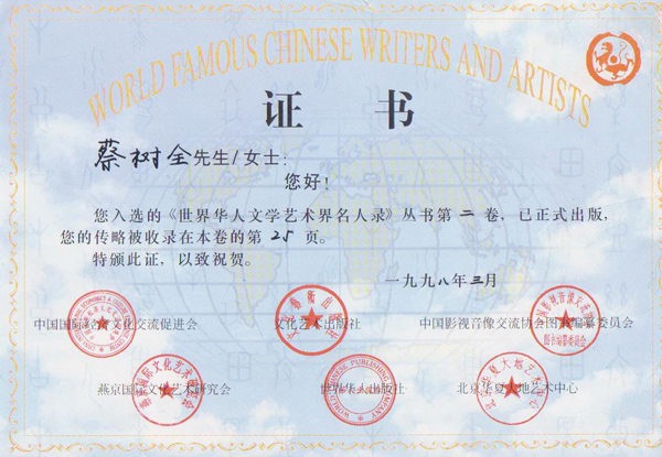 入选《世界华人文学艺术名人录》